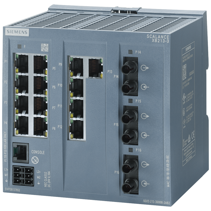 SCALANCE XB213-3 managed Layer 2 IE switch 13x 10/100 Mbps RJ45 ports, 3x MM FO ST port 1x console port, diagnostics LED, redundant power supply, IEC 62443-4-2 certified; temperature range 0 -¦C to +60 -¦C; mounting onto standard rail; default EtherNet/IP