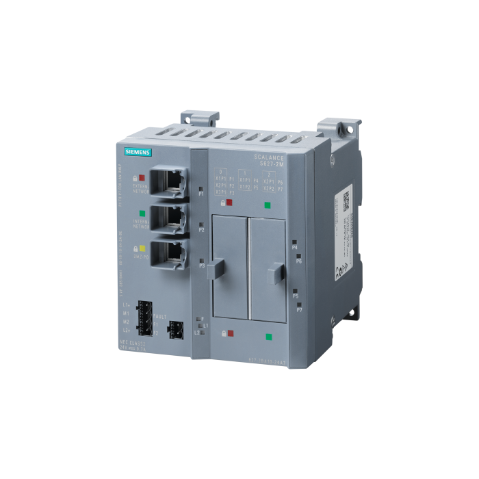 SCALANCE S627-2M module for protection of devices and networks in automation engineering and for protection of industrial communication by means of VPN and firewall; additional DMZ port for connection of a further network; 24 V power supply; further functions: coupling of redundant rings, firewall redundancy. SCALANCE S627-2M MODULE FOR PROTECTING DEVICES AND NETZWORKS IN AUTOMATION AND FOR PROTECTION OF INDUSTRIAL COMMUNICATION VIA VPN AND FIREWALL; ADDITIONAL DMZ-PORT FOR CONNECTING AN ADDITIONAL NETWORK 24 V POWER SUPPLY ADDITIONAL FUNCTIONS: CONNECTION OF REDUNDANT RINGS FIREWALL REDUNDANCY