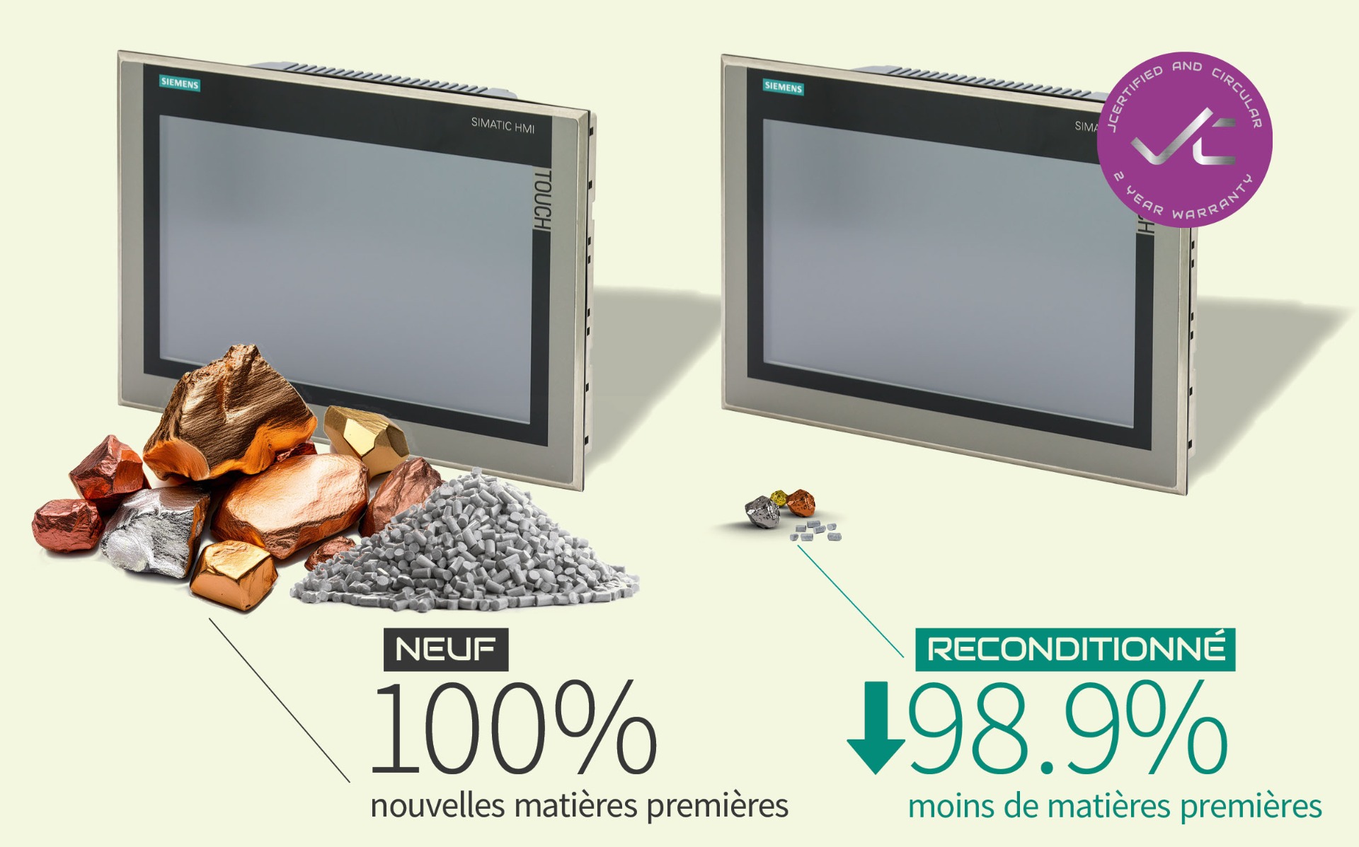 De plus en plus d’entreprises choisissent consciemment l’électronique industrielle reconditionnée JCertified – et ce n’est pas sans bonnes raisons. Elle est moins chère que du neuf, est livrée avec une garantie de deux ans, standard, et a un impact environnemental prouvé et positif. Des données indépendantes montrent que l’utilisation de nos produits reconditionnés permet des économies significatives en matières premières, en eau et en émissions de CO₂.