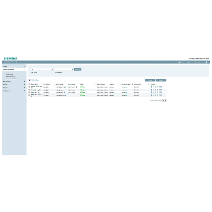 SINEMA Remote Connect Virtual Appliance; Basic software Package for 4 VPN connections User, device, grou management; Certificate management; Autoconfiguration interface SINEMA RC client: for 1 installation Software, Documentation on DVD; License key on USB stick; 2 languages (de, en); Windows 7 SP1 (32/64 bit) Windows 8.1 (64 bit)