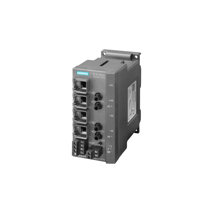 SCALANCE X204-2TS; managed IE switch; 4x 10/100 Mbit/s RJ45 ports; 2x 100 Mbit/s multimode BFOC; LED diagnostics; error signaling contact with set push-button; redundant power supply; PROFINET I/O device; network management; Redundancy Manager integrated, incl. electron. manual on CD-ROM, C-PLUG optional. SCALANCE X204-2TS; MANAGED IE SWITCH; 4 X 10/100MBIT/S RJ45 PORTS; 2 X 100MBIT/S MULTIMODE BFOC; LED-DIAGNOSIS; FAULT SIGNAL- CONTACT WITH SET BUTTON; REDUNDANTE POWER SUPPLY; PROFINET-IO DEVICE; NET WORK- MANAGEMENT; INTEGR. REDUNDANCY MANAGER; INCL. ELECTRON. MANUAL ON CD; C-PLUG OPTIONAL
