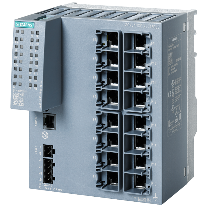 SCALANCE XC216EEC managed Layer 2 IE switch; IEC 62443-4-2 certified; 16x 10/100 Mbps RJ45 ports; 1x console port; diagnostics LED; redundant power supply; with painted printed circuit boards NAMUR NE21-compliant; temp. range -40 -¦C to +70 -¦C; mounting: DIN rail/S7 mounting rail/wall redundancy functions; Office features (RSTP, VLAN,...); PROFINET IO device; Ethernet/IP-compliant; C-plug slot;