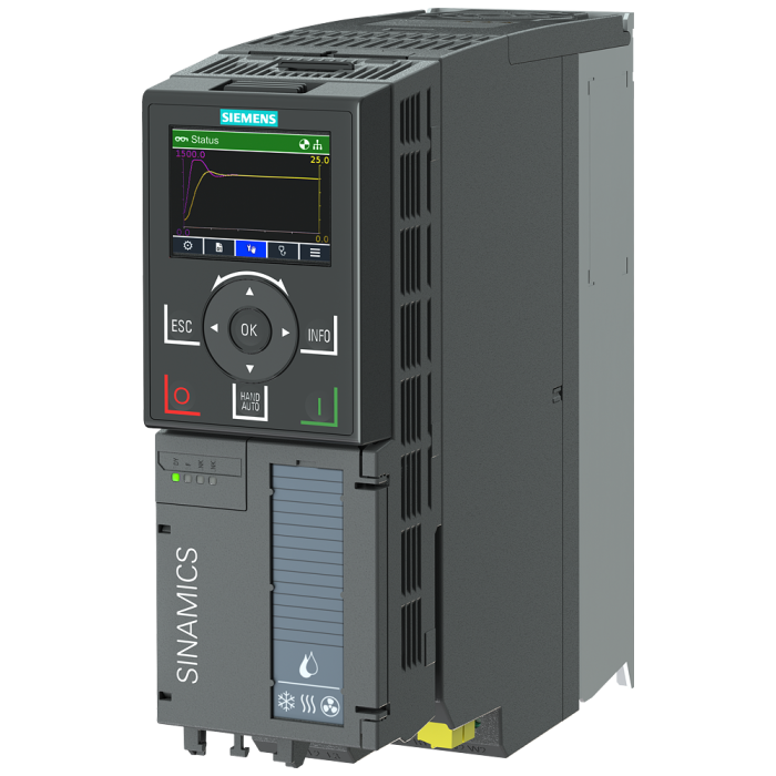 SINAMICS G120X Rated power: 3 kW At 110% 60s, 100% 240 s Radio interference suppression filter for category C2 380-480 V 3 AC +10/-20% 47-63 Hz Ambient temperature -20 to +45 °C Size: FSA Degree of protection IP20 / UL open type painting 3C2 With Intelligent Operator Panel Without IO expansion Fieldbus integrated: PROFINET PN, Ethernet IP