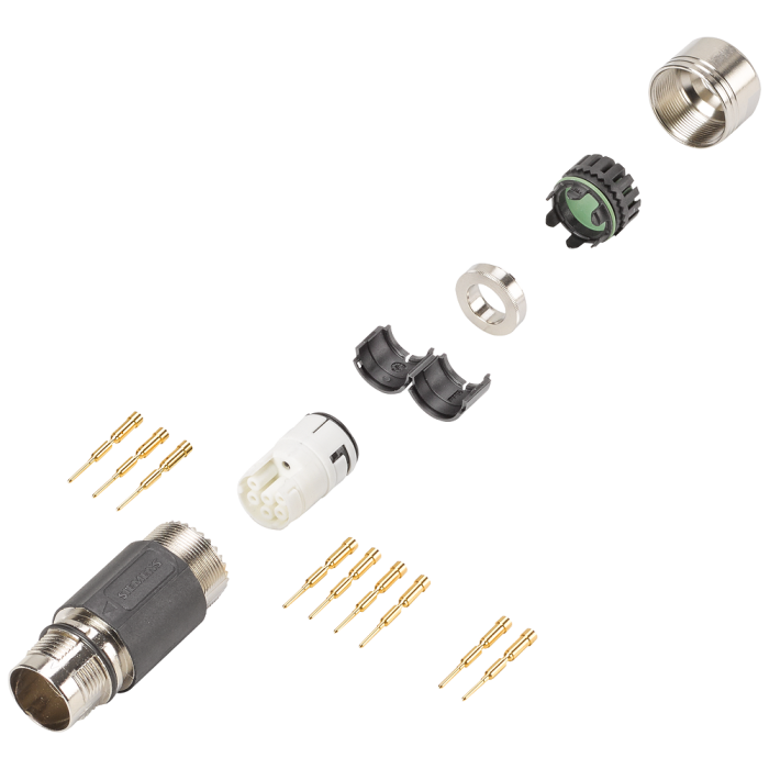 Signal and power connector type: 6FX2003-0SA07 male thread pin Sz. 0.5 (M17) 1 x 7-pole insulator 9 x pin contacts (0.5-1.5 mm2) for cable diameter: 9.5 - 12 Type signaal- en voedingsconnector: 6FX2003-0SA07 pen met buitendraad Sz. 0,5 (M17) 1 x 7-polige isolator 9 x pencontacten (0,5-1,5 mm2) voor kabeldiameter: 9,5 - 12