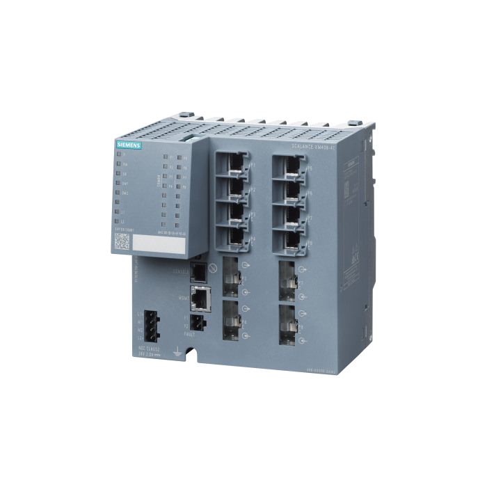 SCALANCE XM408-4C; managed modular IE switch; 8x 10/100/1000 Mbit/s RJ45; 4x 100/1000 Mbit/s ST-/SC- Pluggable as combo ports; in total 8 ports can be used; expandable to 24 ports electrical or optical; assembly: DIN rail/S7 mounting rail, PROFINET IO device; redundancy functions; office features (RSTP, VLAN, IGMP,..); C-plug in scope of delivery; Layer 3 integrated SCHAAL XM408-4C; beheerde modulaire IE-switch; 8x 10/100/1000 Mbit/s RJ45; 4x 100/1000 Mbit/s ST-/SC- Insteekbaar als combopoorten; in totaal kunnen 8 poorten worden gebruikt; uitbreidbaar tot 24 poorten elektrisch of optisch; montage: DIN-rail/S7-montagerail, PROFINET IO-device; redundantiefuncties; kantoorfuncties (RSTP, VLAN, IGMP,..); C-stekker bij levering inbegrepen; Laag 3 geïntegreerd