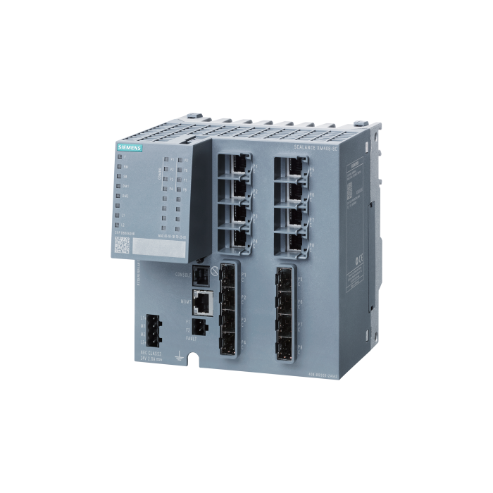 SCALANCE XM408-8C; managed modular IE switch; 8x 10/100/1000 Mbit/s RJ45; 8x 100/1000 Mbit/s SFP; contains 8 combo ports; in total 8 ports can be used; expandable to 24 ports electrical or optical; assembly: DIN rail/S7 mounting rail, PROFINET IO device; redundancy functions; office features (RSTP, VLAN, IGMP,..); C-plug in scope of delivery; Layer 3 integrated SCHAAL XM408-8C; beheerde modulaire IE-switch; 8x 10/100/1000 Mbit/s RJ45; 8x 100/1000 Mbit/s SFP; bevat 8 combo-poorten; in totaal kunnen 8 poorten worden gebruikt; uitbreidbaar tot 24 poorten elektrisch of optisch; montage: DIN-rail/S7-montagerail, PROFINET IO-device; redundantiefuncties; kantoorfuncties (RSTP, VLAN, IGMP,..); C-stekker bij levering inbegrepen; Laag 3 geïntegreerd