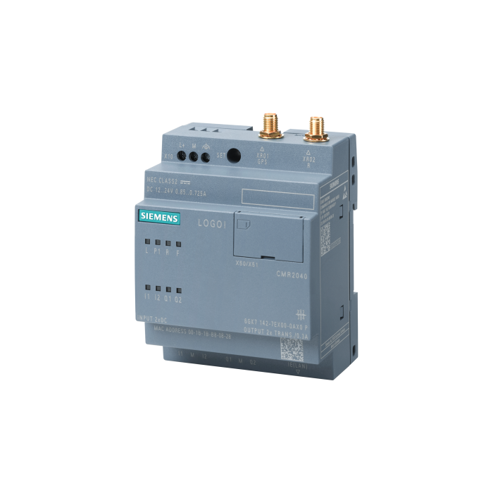 LOGO! CMR2040 communication module for connection LOGO! 8 to LTE network; 1 RJ45 port for Ind. Ethernet connection to LOGO! 8; 2xDI; 2xDQ; Write/read access to LOGO! tags; Text message sending/ receipt; E-mail sending; Position detection GPS; Time synchronization/ forwarding with real-time clock; Configuration/diagnostics via web interface; Remote access via OpenVPN/HTTPs, DynDNS, observe national approval! Manual available as a download LOGO! CMR2040 communicatiemodule voor aansluiting LOGO! 8 naar LTE-netwerk; 1 RJ45-poort voor Ind. Ethernet-verbinding met LOGO! 8; 2xDI; 2xDQ; Schrijf-/leestoegang tot LOGO! labels; SMS verzenden/ontvangen; E-mail verzenden; Positiedetectie GPS; Tijdsynchronisatie / doorsturen met real-time klok; Configuratie/diagnose via webinterface; Toegang op afstand via OpenVPN/HTTPs, DynDNS, nationale goedkeuring in acht nemen! Handleiding beschikbaar als download