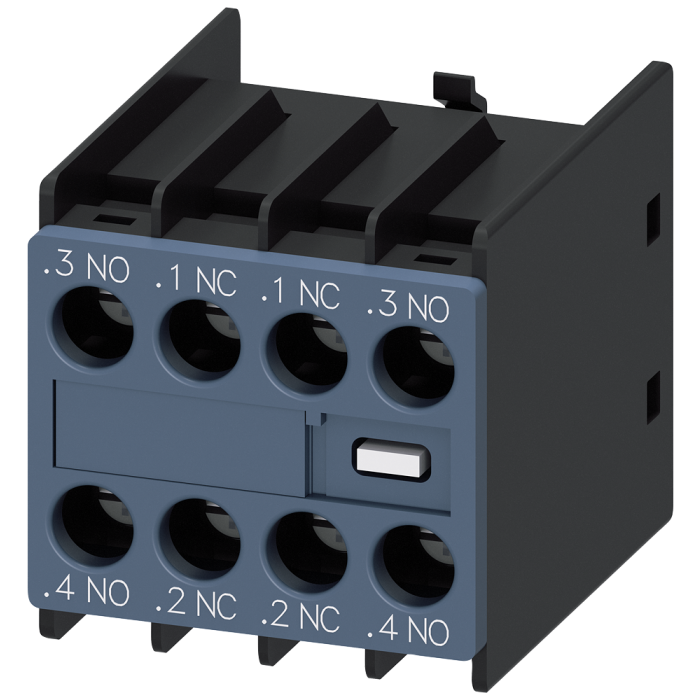 Auxiliary switch on the front, 2 NO + 2 NC Current path 1 NO, 1 NC, 1 NC, 1 NO for 3RH and 3RT screw terminal .3/.4, .1/.2, .1/.2, .3/.4 Hulpschakelaar voorzijde, 2 NO + 2 NC Stroompad 1 NO, 1 NC, 1 NC, 1 NO voor 3RH en 3RT schroefklem .3/.4, .1/.2, .1/.2, .3/.4