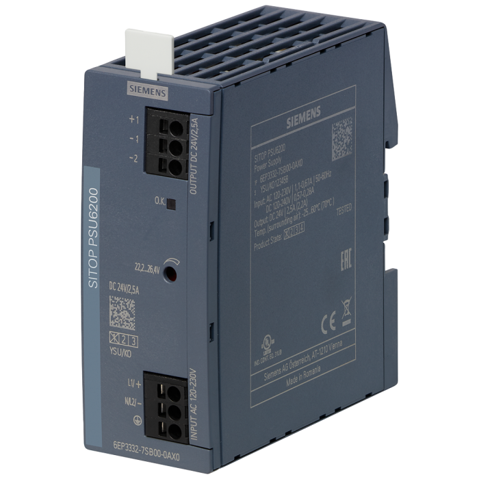 SITOP PSU6200 24 V/2.5 A Stabilized power supply Input: 120 - 230 V AC, (120 - 240 V DC) Output: 24 V DC/2.5 A